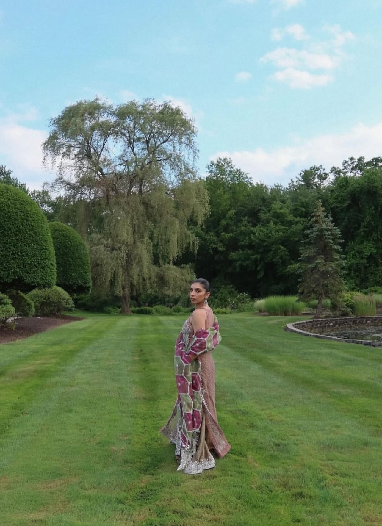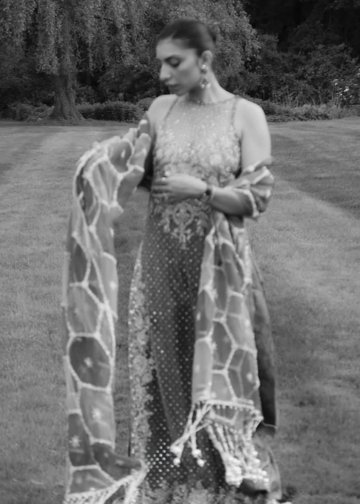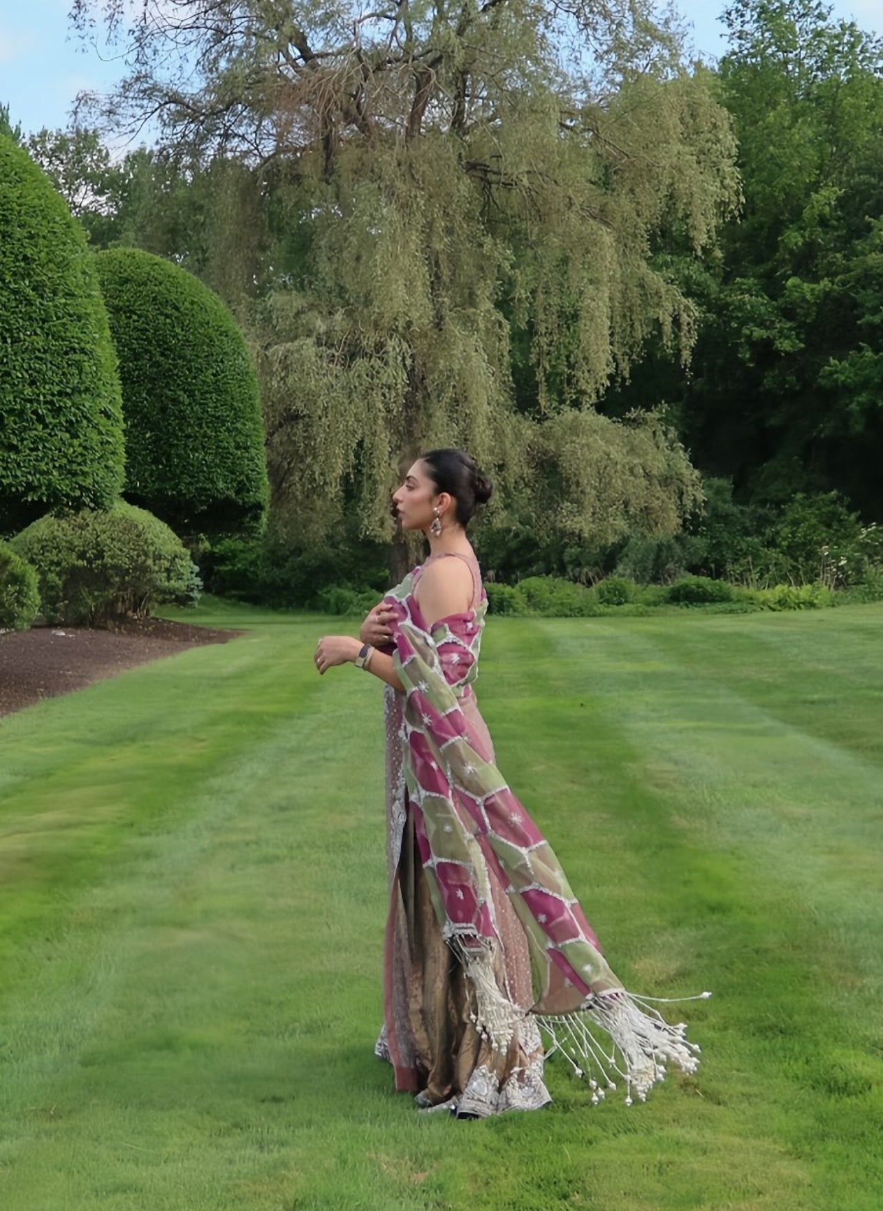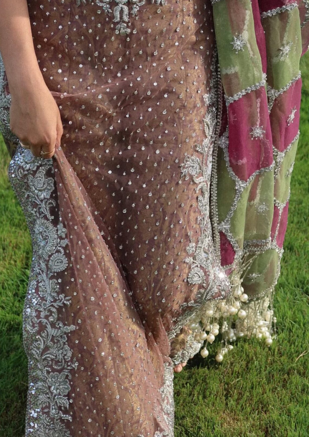 Maheen wears a net shirt in peach pink, hand-embellished along the neckline, sides, and corners, with a dense spray of work throughout. The sharara is lilac jamawar with a four-inch silver-worked border. The dupatta is panelled in a hexagon layout, split between olive green and pink, detailed with hand embellishments and finished with heavy pearl tassels on the pallu