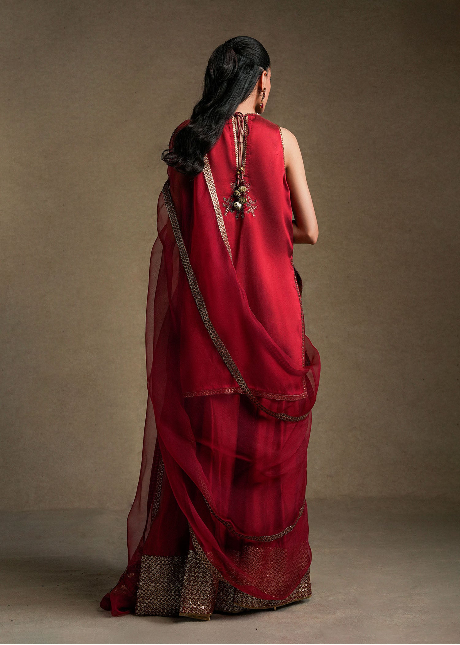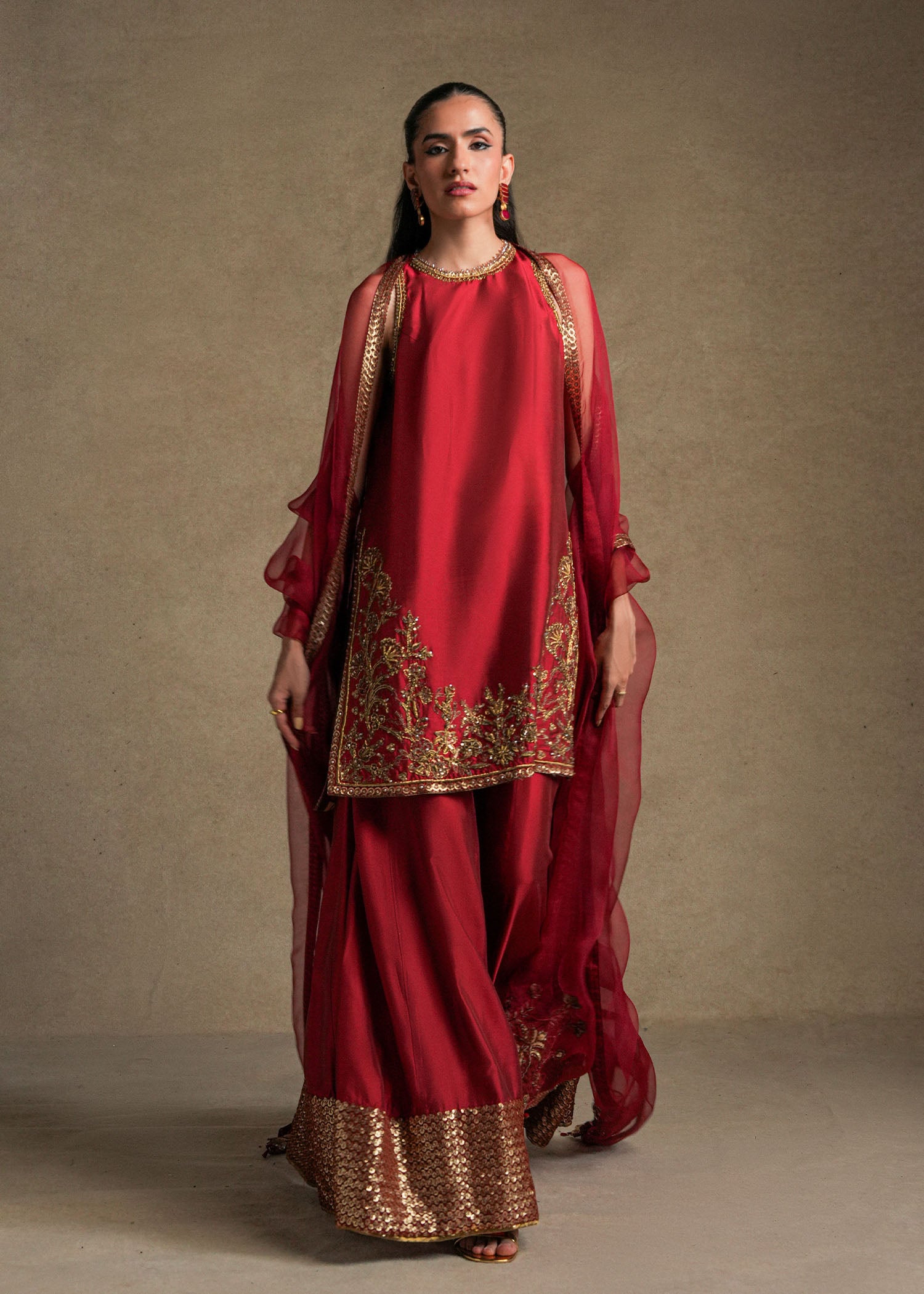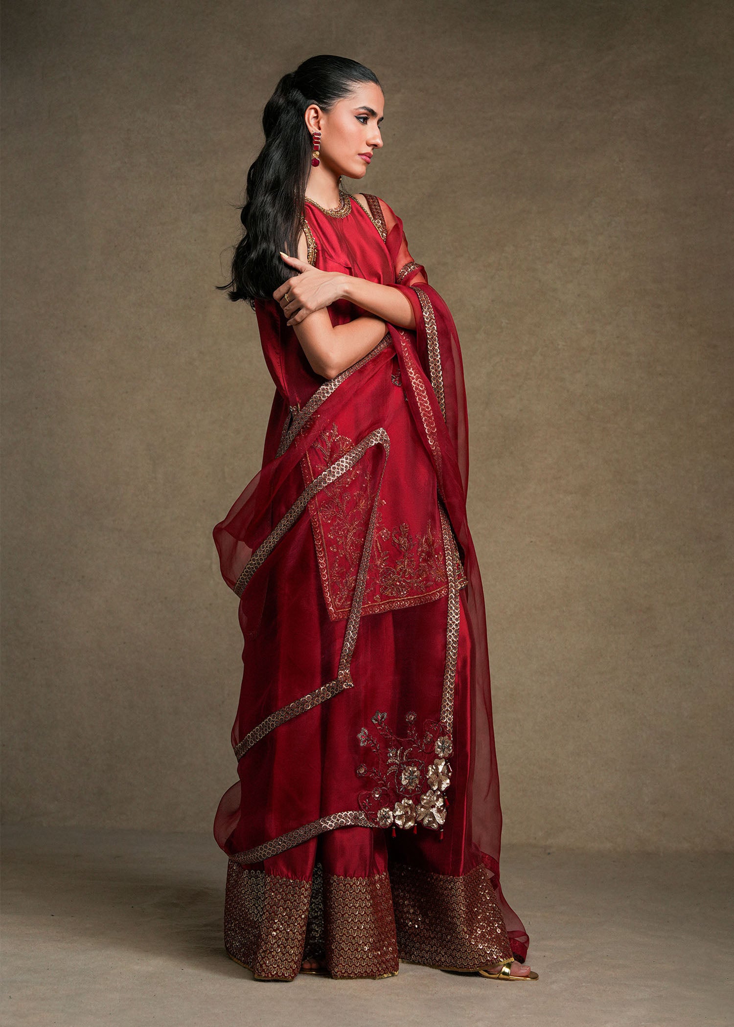 A deep maroon halter-neck short shirt in sheesha silk, highlighted with gold sequin detailing along the neckline and armholes. The hem is richly handworked with dabka, crystals, and cutdana, rising artistically along the sides to the waist. Paired with a flared sharara finished with a wide sequin border, and an organza dupatta framed with floral-patterned pallus and gold sequin edging on all four sides. A refined composition of modern allure and enduring craft.