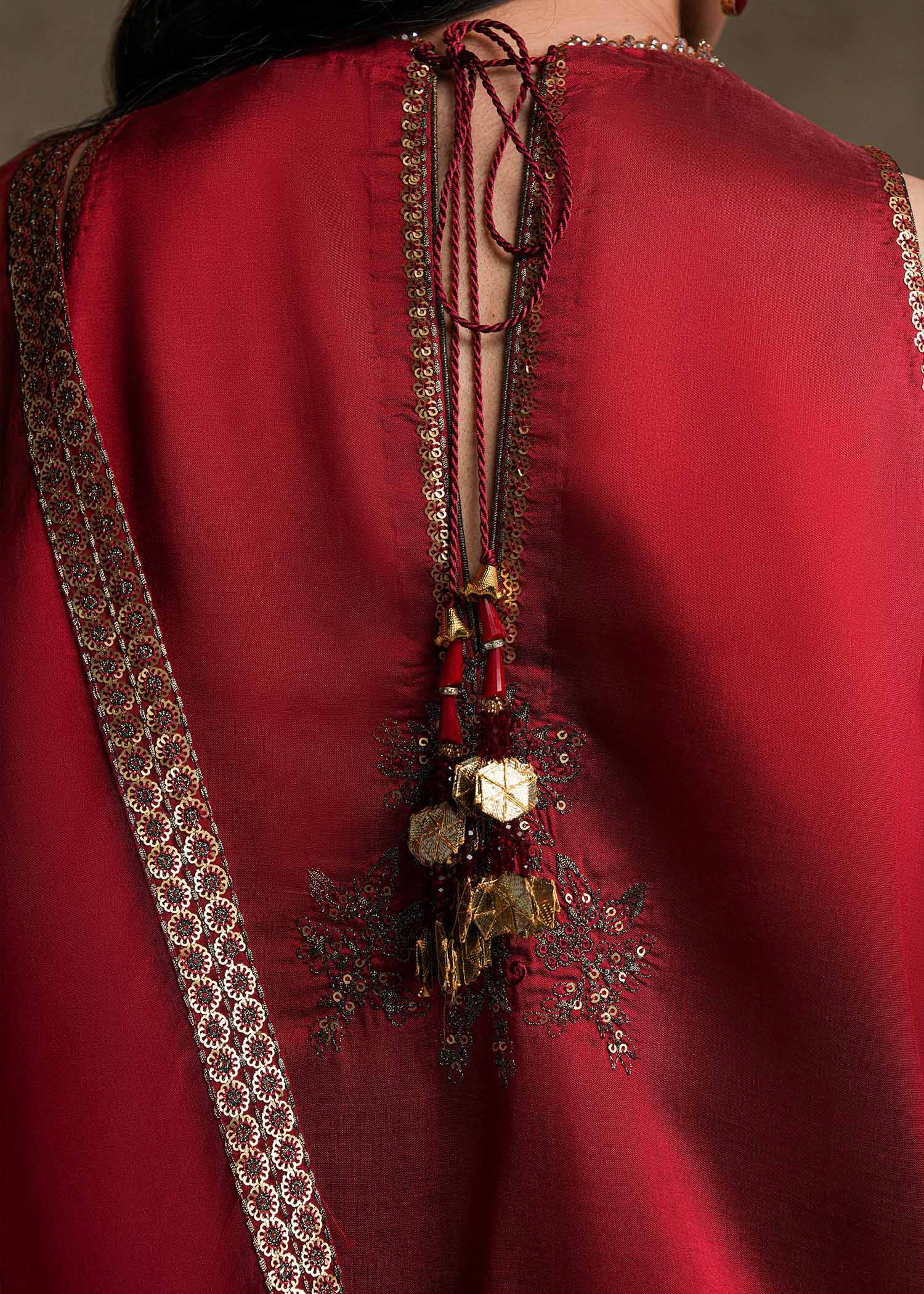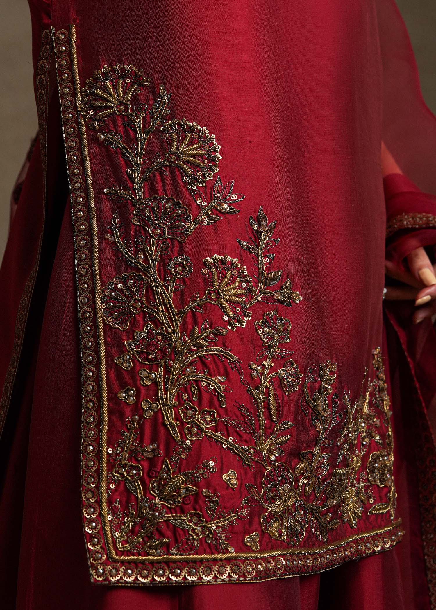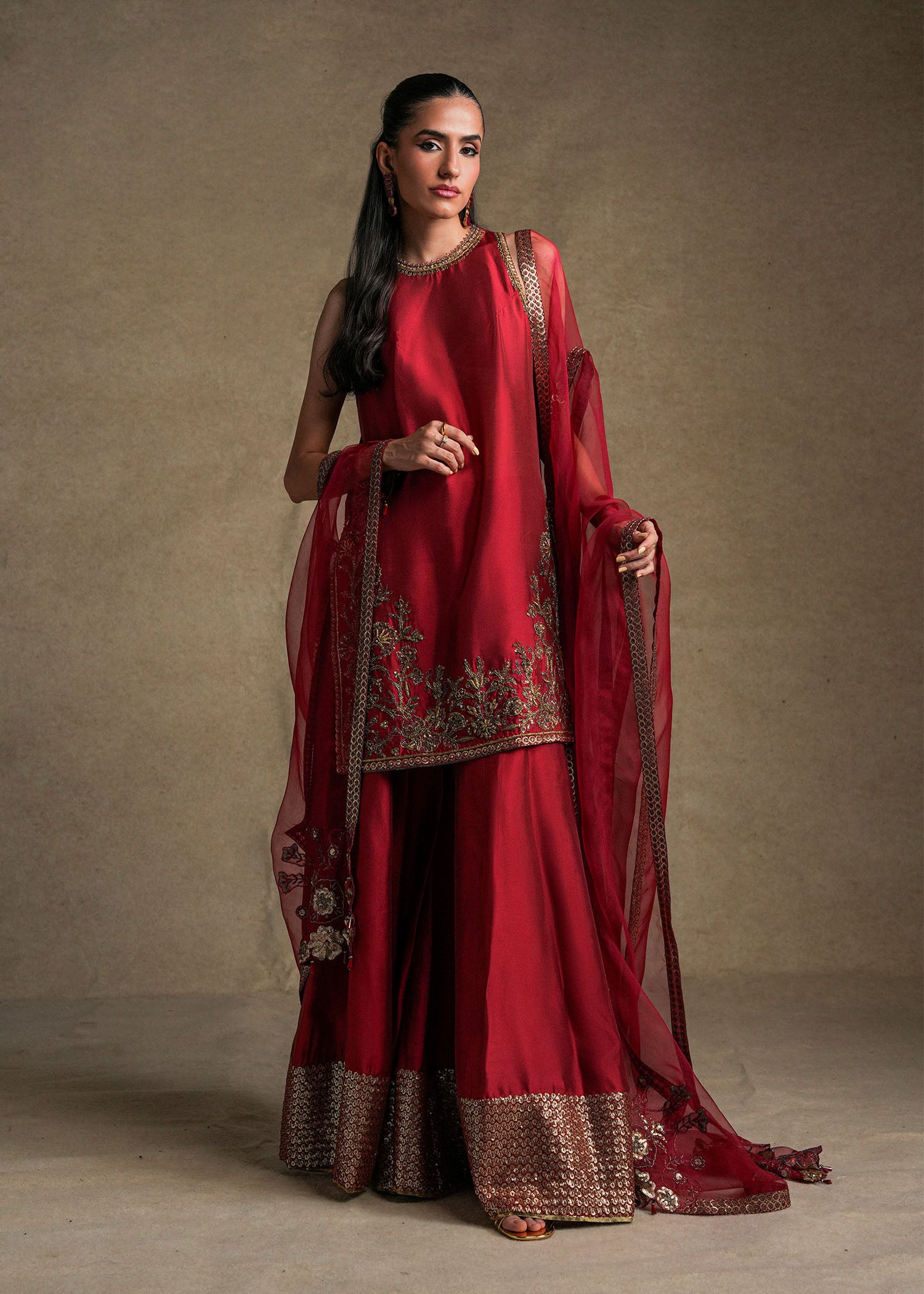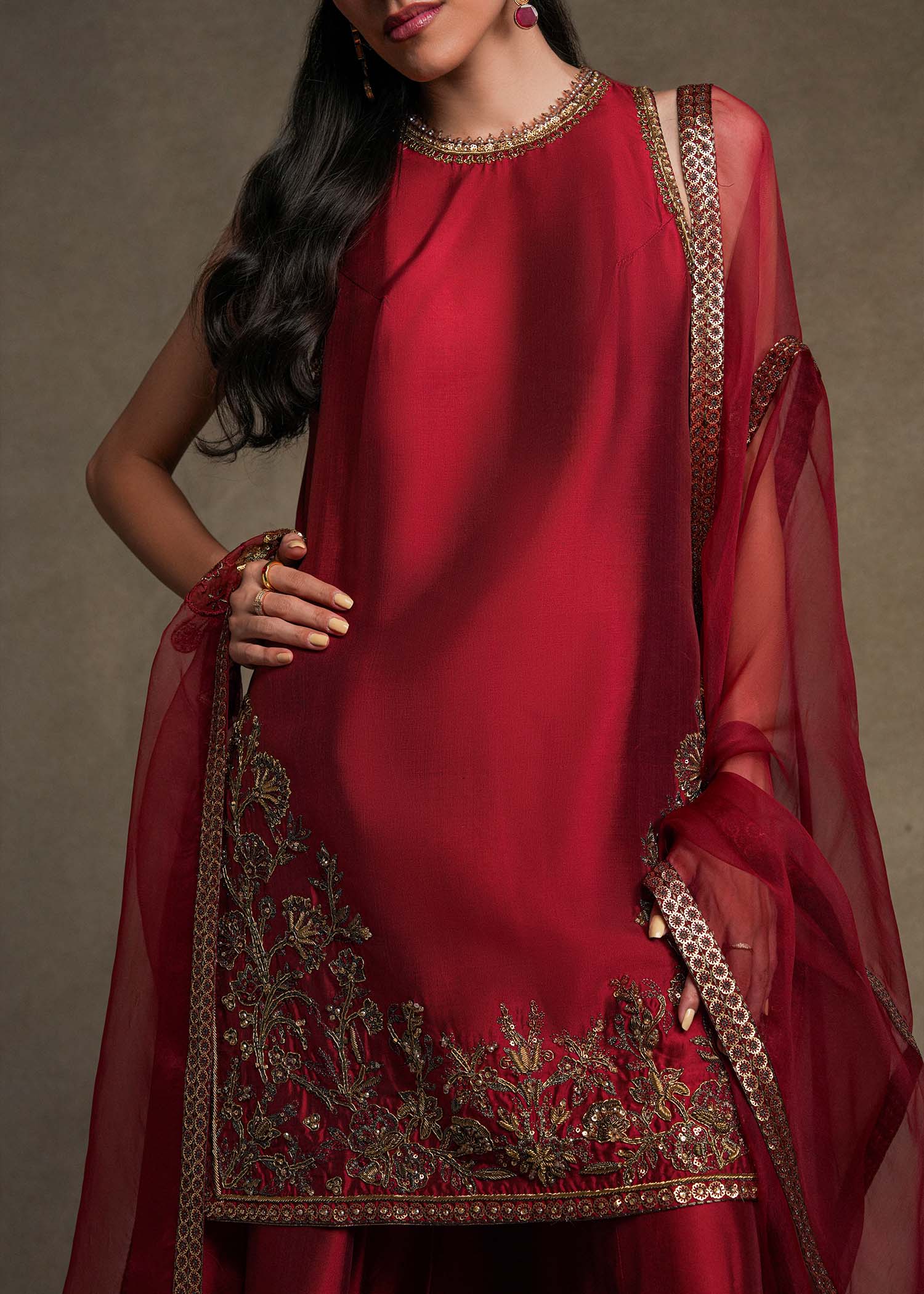 A deep maroon halter-neck short shirt in sheesha silk, highlighted with gold sequin detailing along the neckline and armholes. The hem is richly handworked with dabka, crystals, and cutdana, rising artistically along the sides to the waist. Paired with a flared sharara finished with a wide sequin border, and an organza dupatta framed with floral-patterned pallus and gold sequin edging on all four sides. A refined composition of modern allure and enduring craft.
