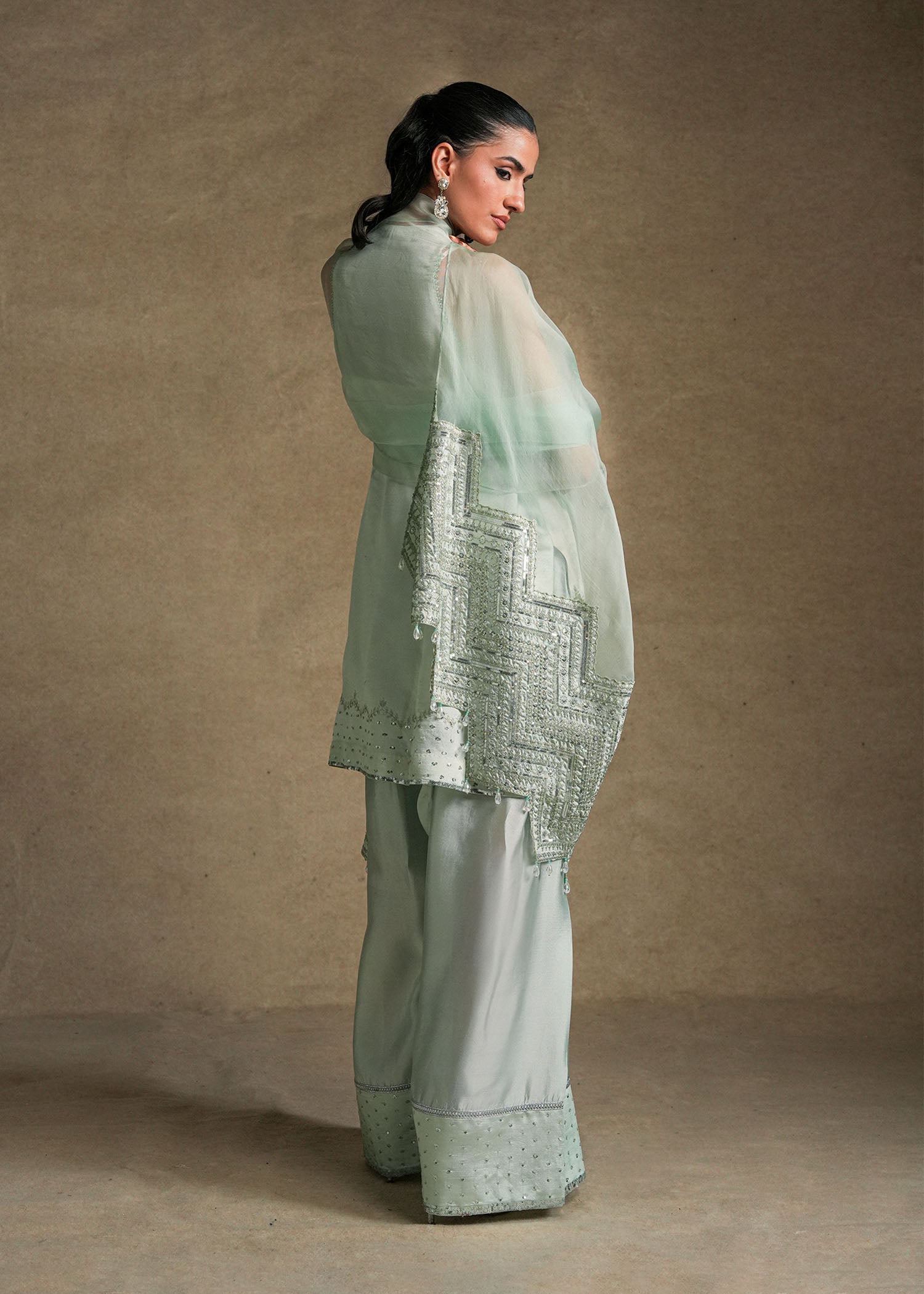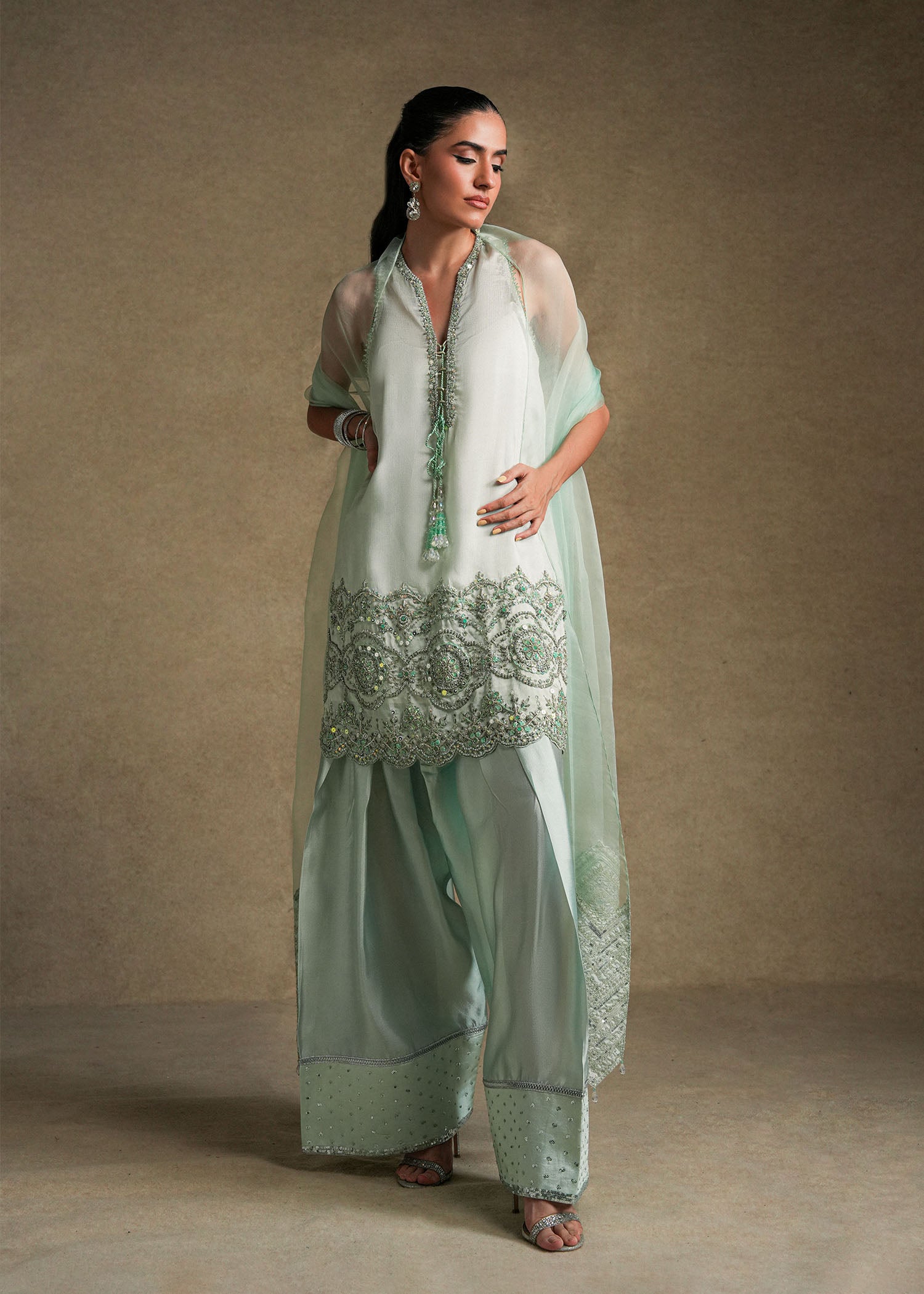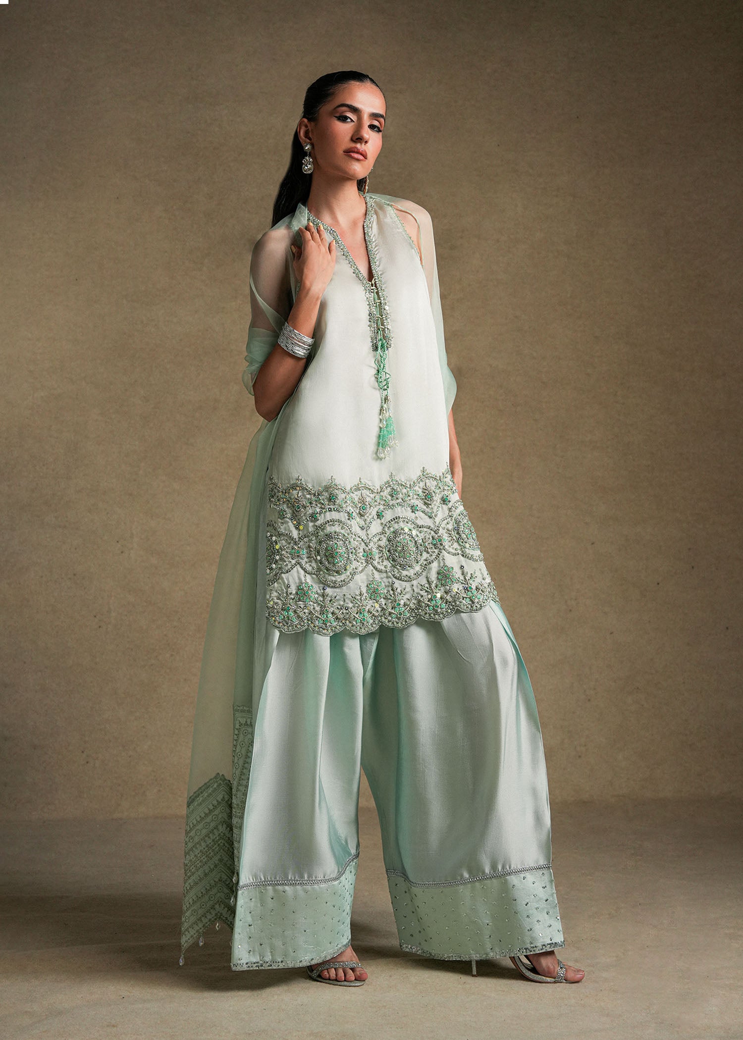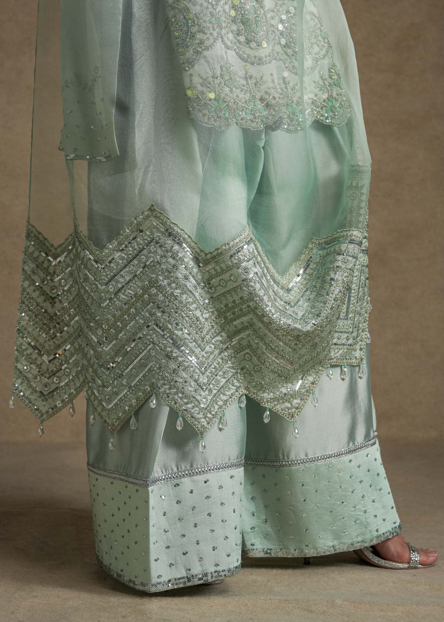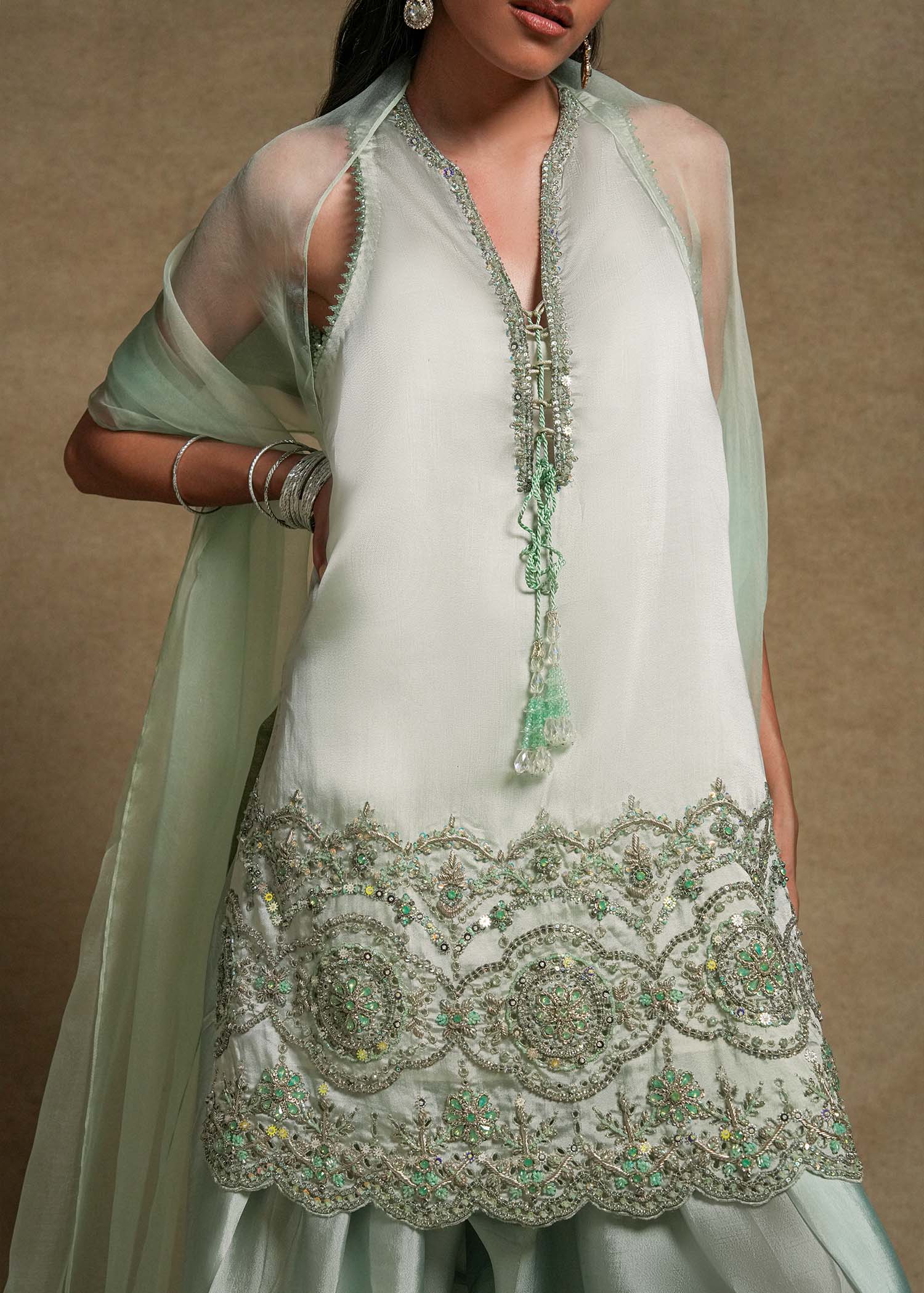 Paired with a farshi shalwar highlighted with sequin detailing at the hem, and an organza dupatta featuring embroidered enhanced pallus with dainty crystal hangings.