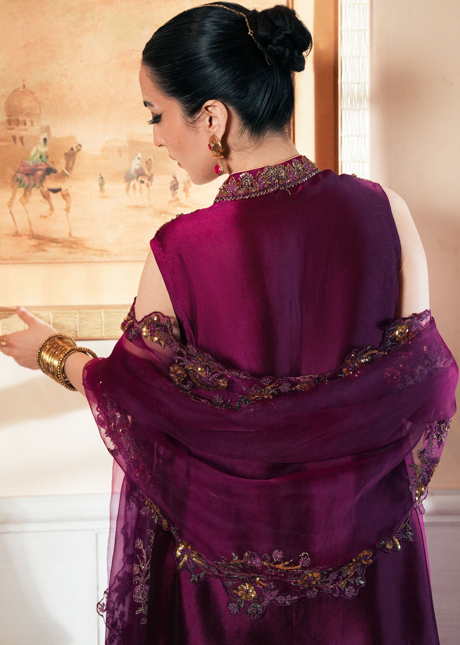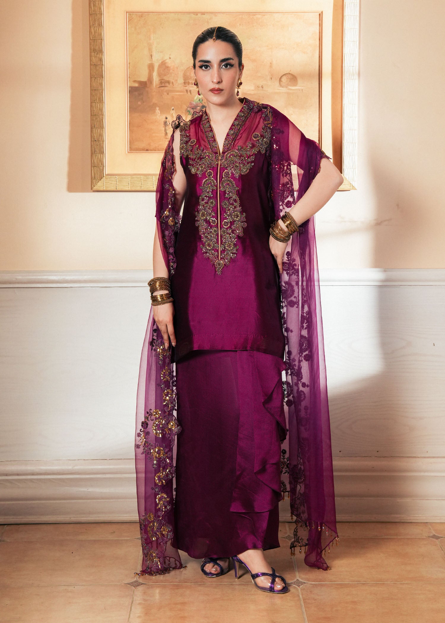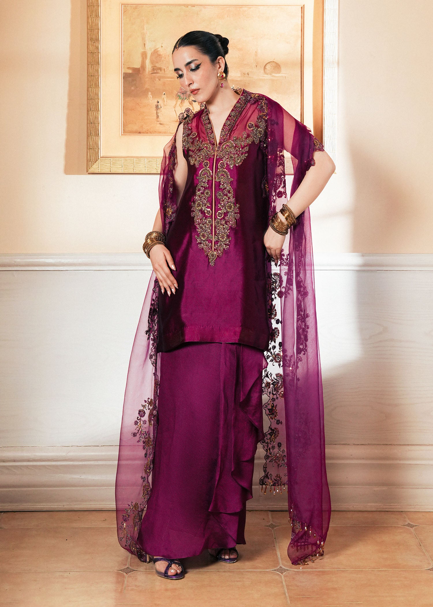 A dark plum sleeveless short shirt in sheesha silk, highlighted with organza detailing at the neckline and a hand-embellished front that extends to the waist, finished with a worked neckline border. Paired with a wrap-around skirt that creates a contemporary silhouette, and a sheer organza dupatta edged with sequined borders and soft tassels. A refined composition of tradition, craft, and modern design.