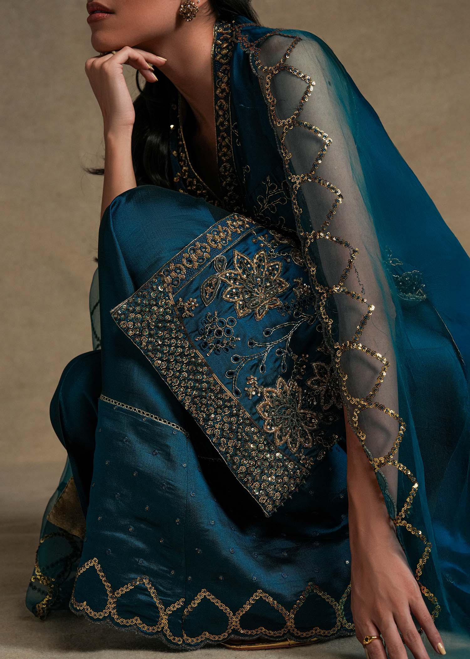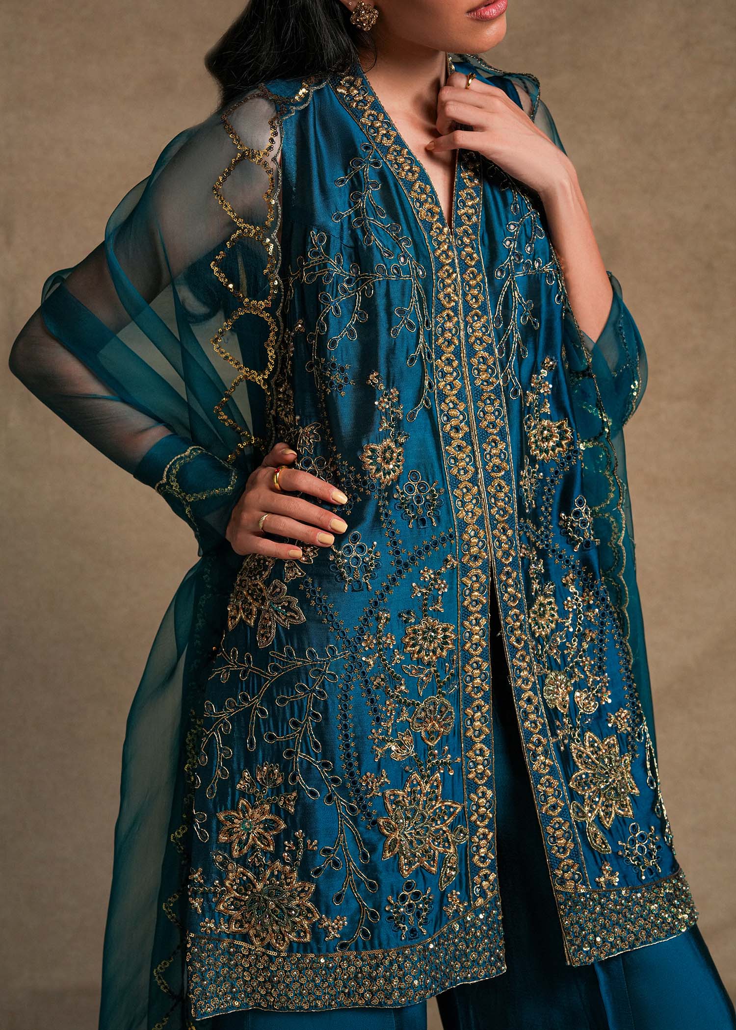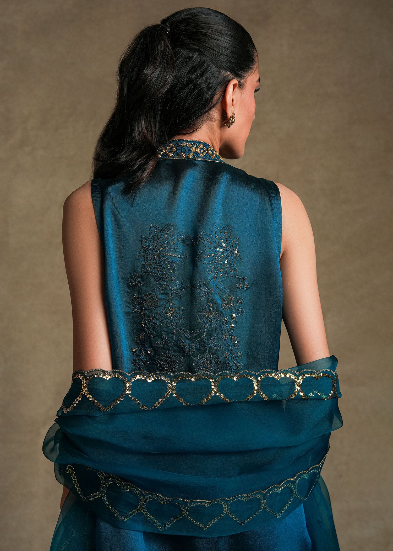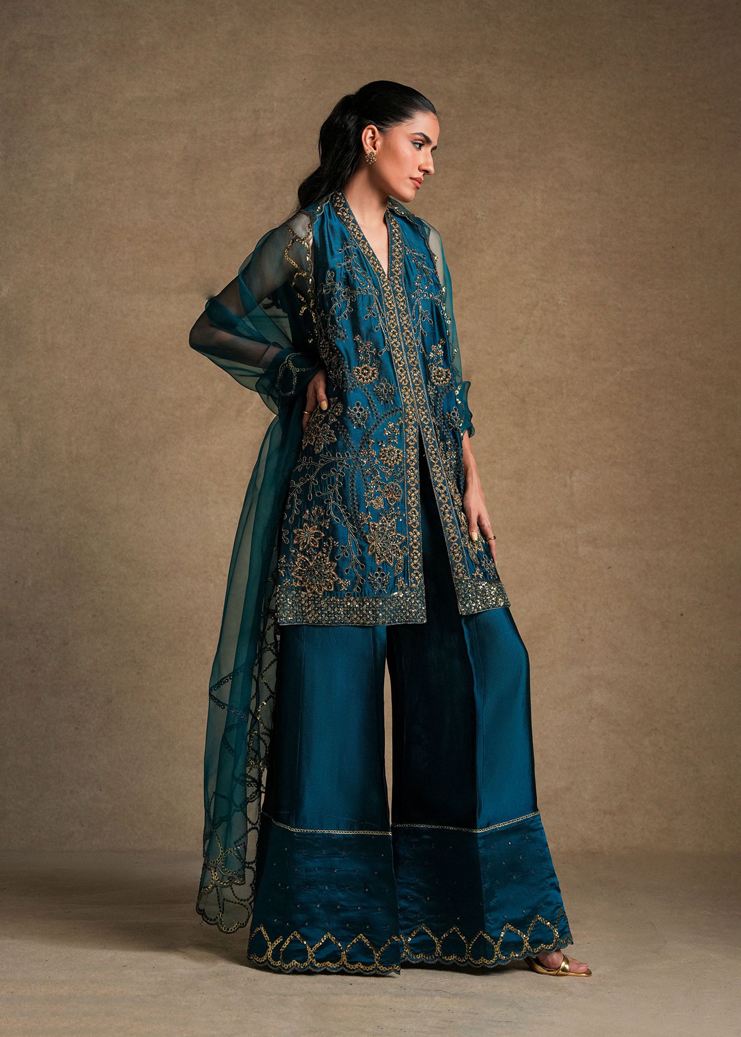 A captivating dark teal front-open short shirt in sheesha silk, adorned with intricate dabka, crystal, and resham embellishments, enhanced by delicate cutwork detailing. Paired with boot-cut sheesha silk pants featuring sequin heart motifs along the hem, and a sheer organza dupatta bordered with matching sequin heart detailing. A perfect balance of sophistication and modern charm.